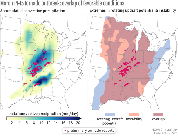 Tornado activity (red dots) during the March 14-15, 2025, outbreak was concentrated in areas where heavy convective rainfall (left map, darkest blue areas) overlapped with the areas of extreme atmospheric instability (right map, orange shading) and wind shear/rotation potential (right map, blue shading).